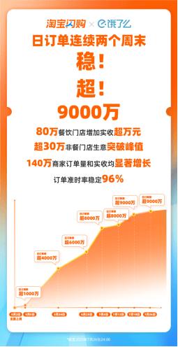 7月28日,淘寶閃購和餓了么聯合宣布,連續兩個周末日訂單超過9000萬(不含0元購及自提)。雖然連續兩周國內大范圍強降雨,但消費熱情不減,淘寶閃購的訂單準時率穩定在96%。