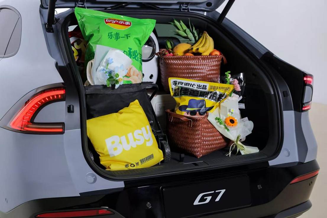 小鵬G7還是載物神器,42L的前備廂42L能水洗!露營回來沾滿泥的鞋子直接扔進去,回家直接沖一沖,后備廂的空間有819L,實測塞進去2個28寸+2個24寸+1個20寸行李箱還有不少空余。要是把后排放倒,最大能擴展到2277L,搬家拉個小家具估計都行,后備廂蓋板掀開,下面居然還有個巨大的隱藏儲物格,自帶卡槽立起來方便拿東西,還能變身小桌板腿!