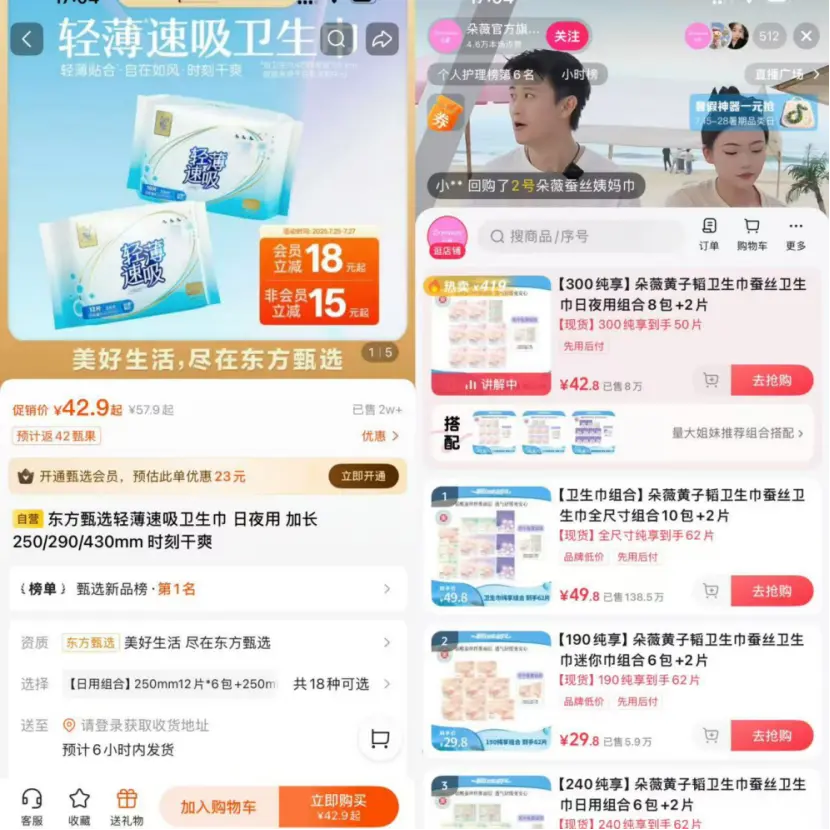 對(duì)于俞敏洪來說,他能夠利用自身的流量?jī)?yōu)勢(shì),省去高昂的營(yíng)銷和流通費(fèi)用。目前,東方甄選衛(wèi)生巾不僅在自有APP平臺(tái)銷售,也在東方甄選的多個(gè)直播間進(jìn)行銷售。