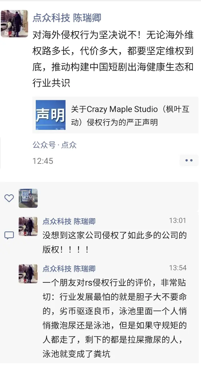 點眾科技CEO陳瑞卿在朋友圈里連發了三條相關動態,并表示,“無論海外維權路多長,代價多大,都要堅定維權到底。”“這是劣幣驅除良幣。”