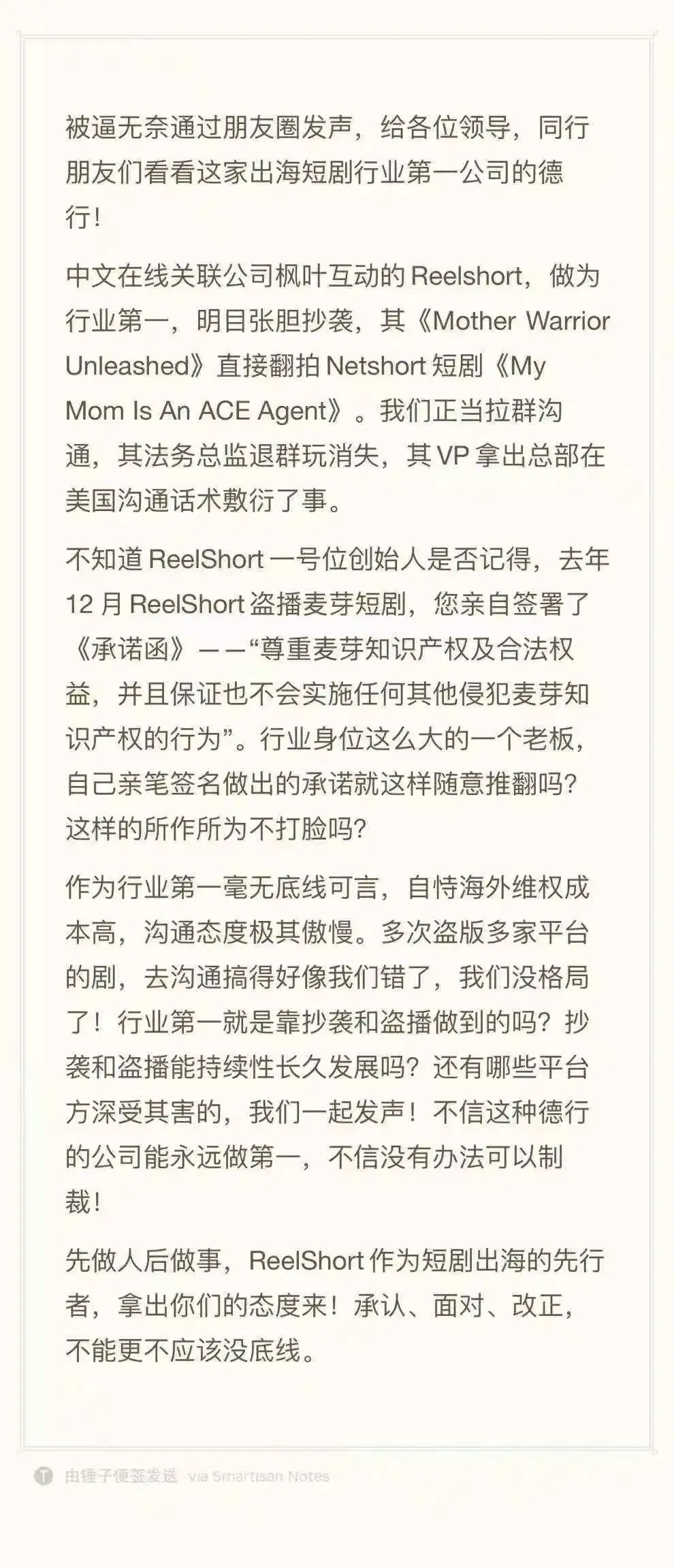 麥芽短劇海外負責人王利還在朋友圈分享稱:ReelShort的法務總監曾從雙方的溝通群中突然退群消失,ReelShort的創始人曾親自簽署不會侵犯麥芽知識產權的《承諾函》但又隨意推翻,“被逼無奈通過朋友圈發聲。”