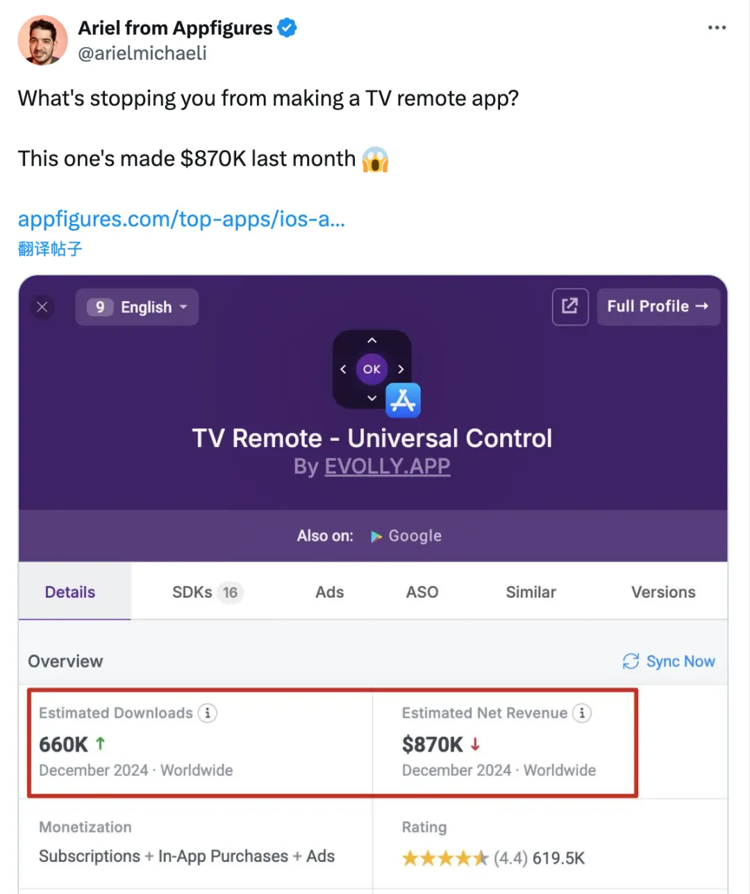他貼了一張圖:一個名為 TV Remote (電視遙控器)的 App,在 2024 年 12 月掙了 87 萬刀。
