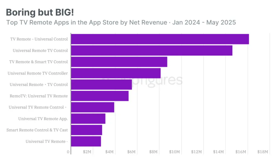 在 Appfigures 今年發布的“ Boring but BIG ”(沒創新但超賺錢)報告中,21 款電視遙控器 App 的年收入都超過了 100 萬美元。
