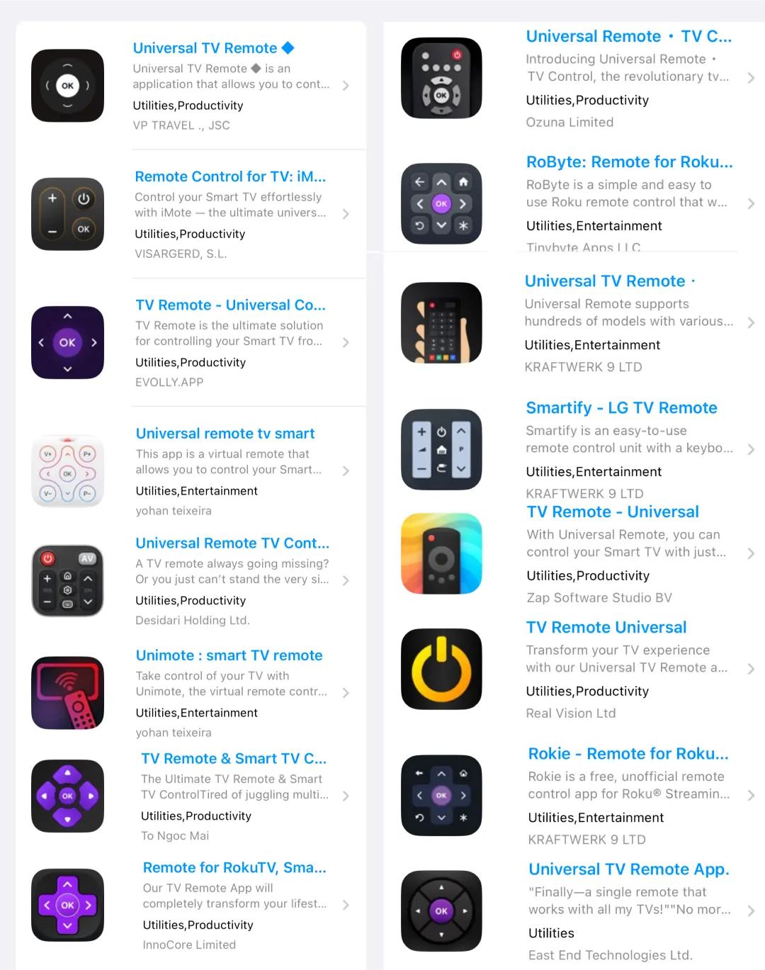 而此時那些第三方遙控器 App,早就用 Universal TV Remote ( 萬能遙控器 )這個金字招牌,在搜索結果里嚴陣以待了。