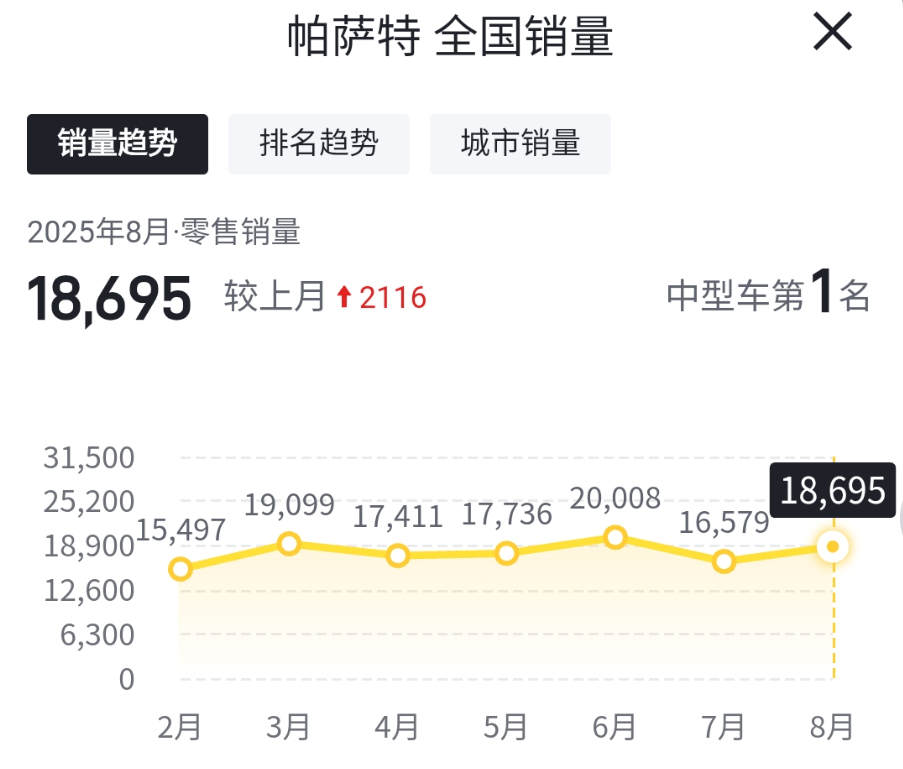 8月份,帕薩特的銷量逼近1.9萬臺,這樣的數據或許不夠直觀,但只要對比一下同期比亞迪漢不到8000臺的銷量,就能清晰感受到這臺“油車老將”的強勁勢頭。