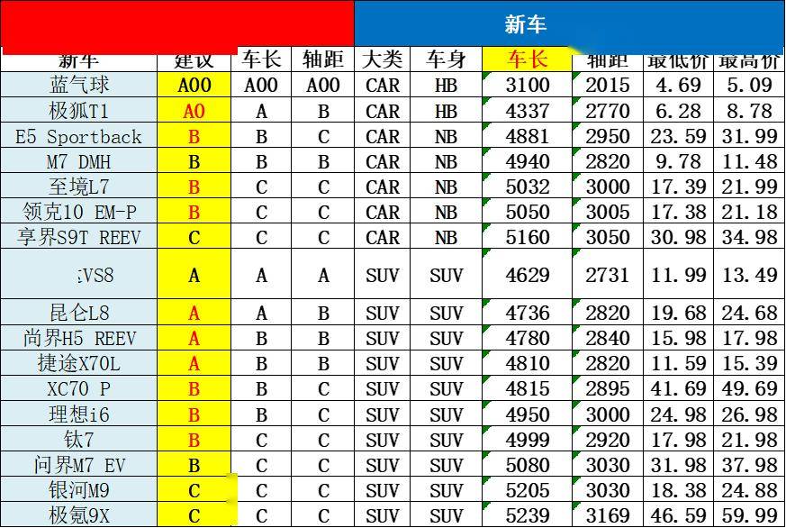 近期乘用車市場的傳統車市場推出新車型逐步放緩,新能源大幅增加新品投放。目前主力車企產品逐步進入多生孩子好競爭的局面,車企呈現劇烈的價格競爭和破圈趨勢。這些傳統車和新能源車的新車型如何歸類也是很重要的,每家都有自己的分級模式,但我們還是習慣用行業相對主流的源自于德國大眾的A00、A0、A、B、C、D分級模式作為基礎,成為行業參照的公用分級方式。對這個行業分級,測算本月新車的分級如下,具體的調整也是僅供討論。如有不同觀點也可留言。