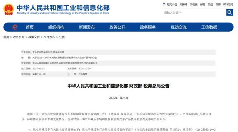 它就是工信部等三部門(mén)在10月9日,聯(lián)合發(fā)布的《關(guān)于2026—2027年減免車(chē)輛購(gòu)置稅新能源汽車(chē)產(chǎn)品技術(shù)要求的公告》, 簡(jiǎn)單概括就是明年起,新能源車(chē)購(gòu)置稅減免技術(shù)門(mén)檻提高。