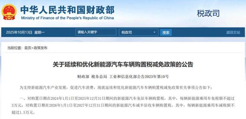 實(shí)際上,在明年,要落地的新能源政策不只這一份,9月11日,財(cái)政部稅務(wù)總局和工業(yè)和信息化部發(fā)布《關(guān)于延續(xù)和優(yōu)化新能源汽車(chē)車(chē)輛購(gòu)置稅減免政策》的公告。從2026年1月1日起,新能源汽車(chē)購(gòu)置稅免征政策結(jié)束,變?yōu)闇p半征收購(gòu)置稅。