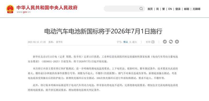 早在4月份,工業(yè)和信息化部組織制定的強(qiáng)制性國(guó)家標(biāo)準(zhǔn)《電動(dòng)汽車(chē)用動(dòng)力蓄電池安全要求》,將于2026年7月1日起開(kāi)始實(shí)施。