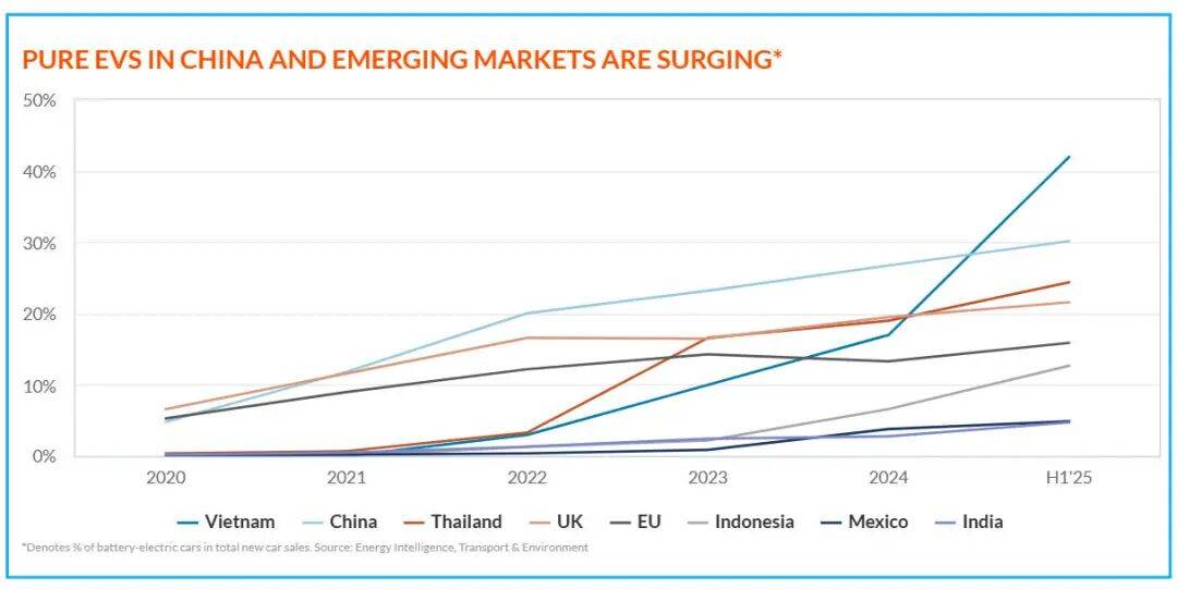 總部位于布魯塞爾的綠色交通組織“交通與環境”9月份發布的報告顯示,越南的電動汽車銷量也從2023年占新車銷量的10%躍升至2024年的17%,并在2025年上半年達到42%左右。越南主要是一個純電動汽車市場,國際能源署的數據顯示,去年該國售出了6.9萬輛電動汽車。