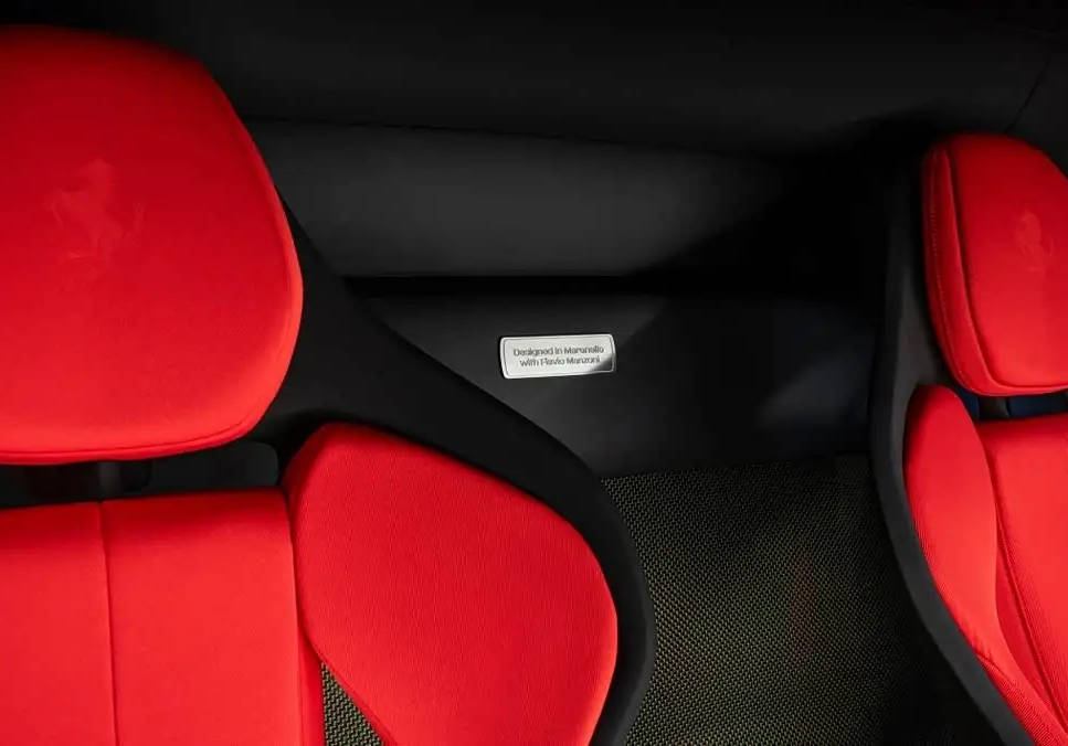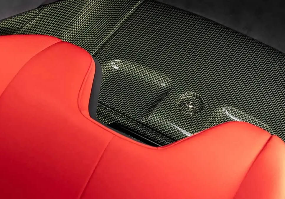 內飾延續經典與現代的融合思路,腳踏區、座椅靠背、儀表臺及方向盤裝飾件均采用碳-凱夫拉復合材料,這種曾助力F40實現極致輕量化的材質,如今以更先進工藝重現江湖。座椅采用紅色提花織物與黑色Alcantara材質拼接,還原了F40簡約絨面儀表板的運動風格,在細節處呼應復古主題。