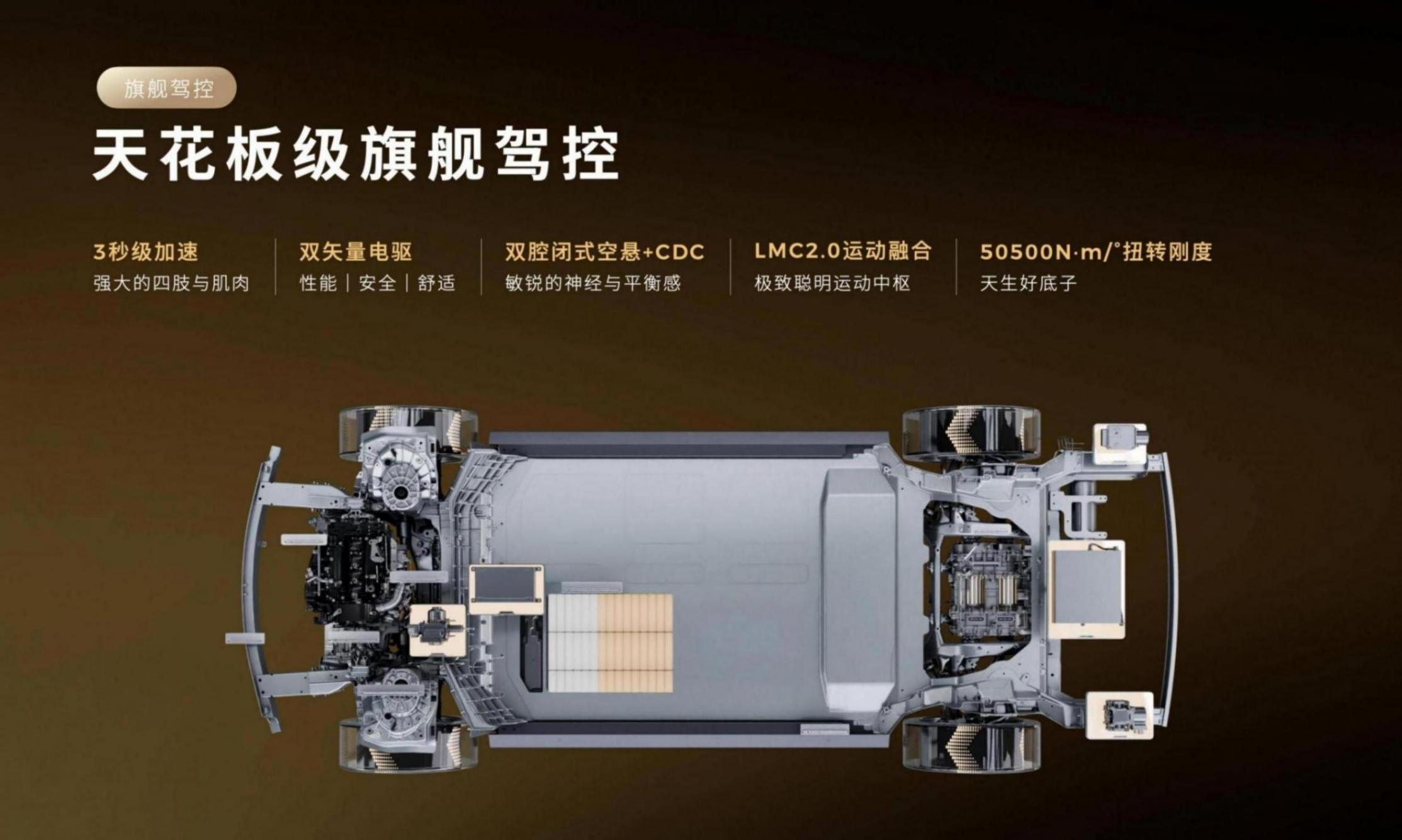 而純電版車型采用了全棧千伏高壓系統,配備115千瓦時的寧德時代混合電芯電池,CLTC續航達720公里。另外其充電15分鐘就可補充超過350公里的續航里程。三電機四驅版本系統最大功率540千瓦,零百加速進入3秒級。
