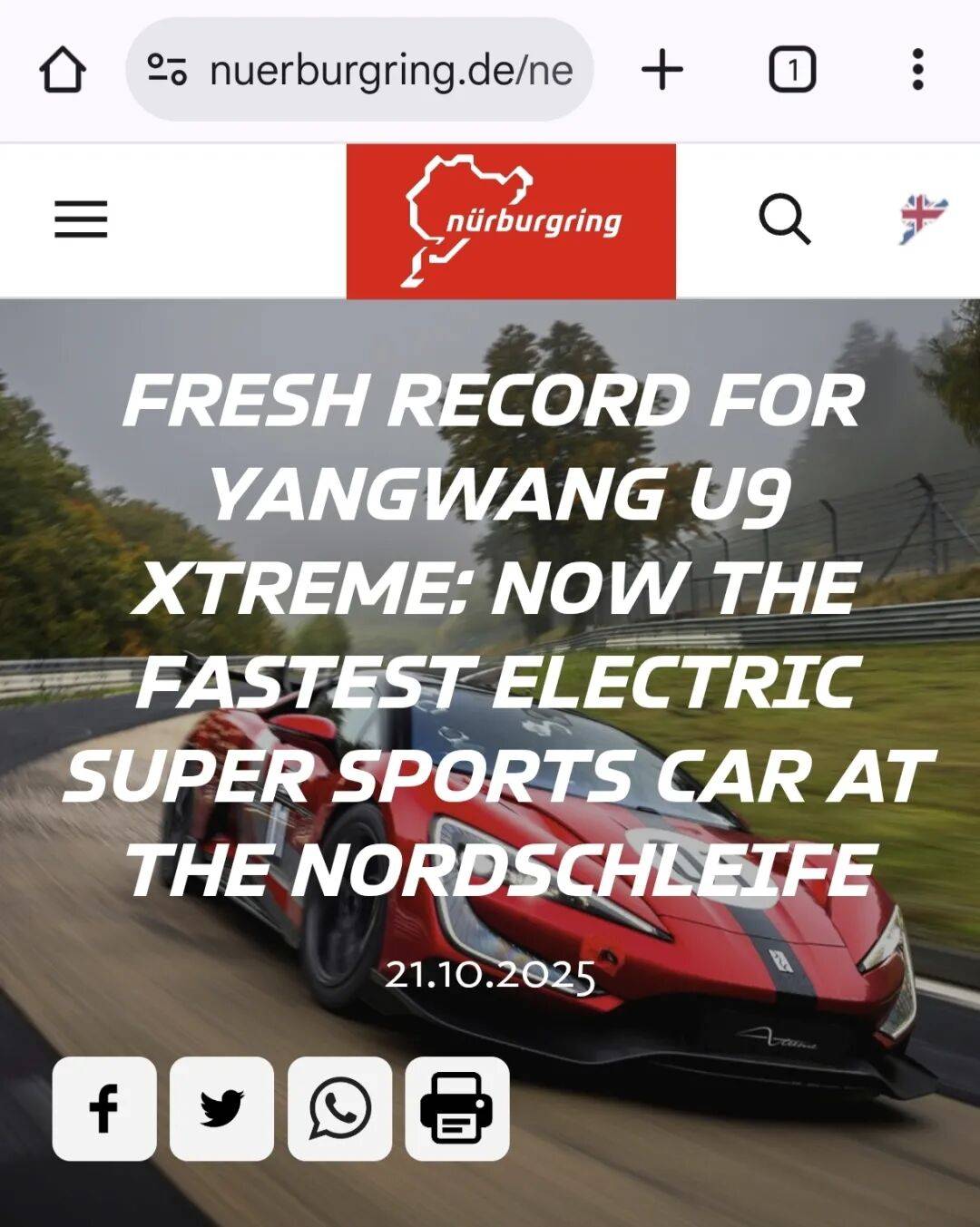 10月21日,德國紐北官網顯示:仰望U9X成為紐北賽道量產電動Super Sports Cars組別冠軍。圈速成績6.59.157。
