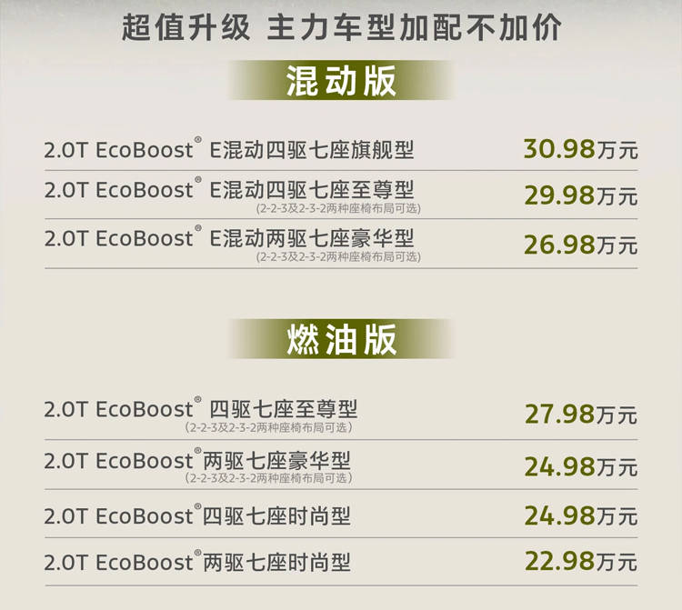銳界L有燃油和混動兩種版本,其中混動版搭載了福特2.0T大馬力E混動系統,集福特全新第五代2.0T EcoBoost 雙渦流渦輪增壓發動機與成熟先進動力分流技術于一身,發動機最大馬力275Ps、峰值扭矩405N·m,高速扁線油冷電機最大馬力190Ps、峰值扭矩140N·m,可實現7.1秒零百加速超強性能、6升級WLTC超低百公里油耗、1188公里超長續航,僅用加92號油,且無需充電,出行再無充電樁焦慮。配合智能機械四驅加持,使得福特銳界L具備了卓越的道路行駛穩定性和復雜路況脫困能力,真正實現了“既猛又省還好開”。