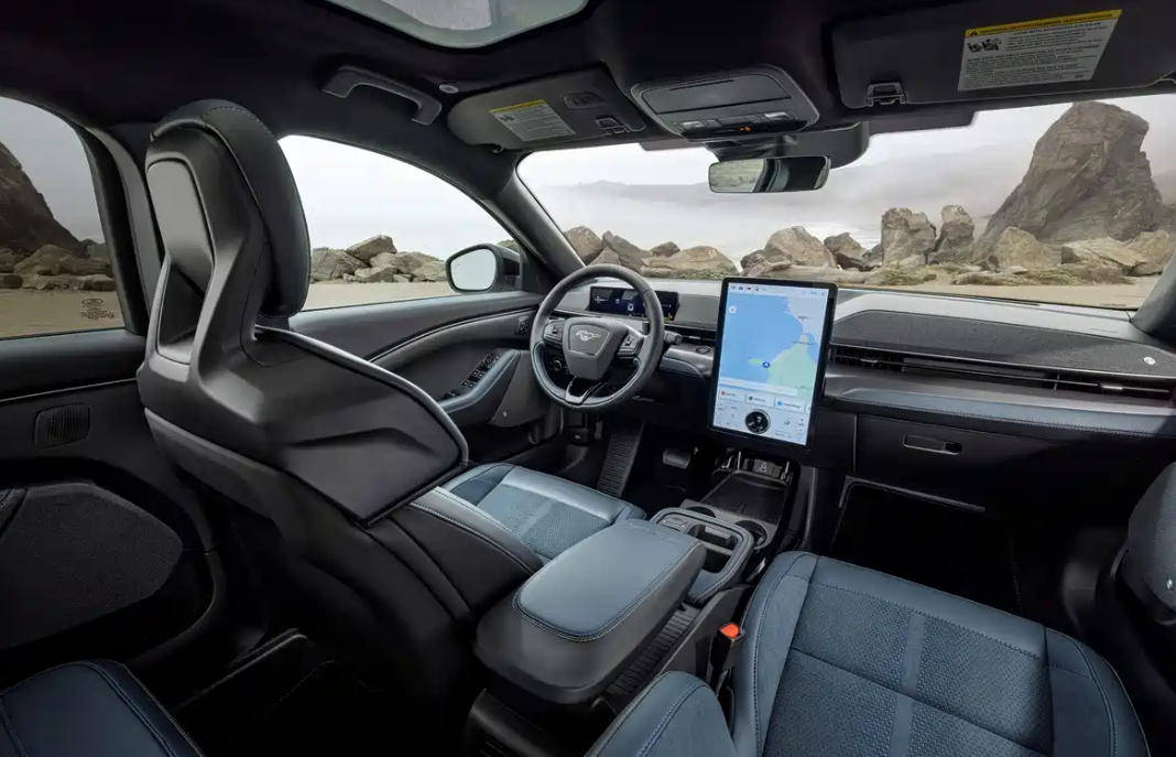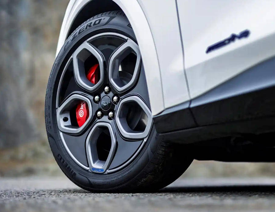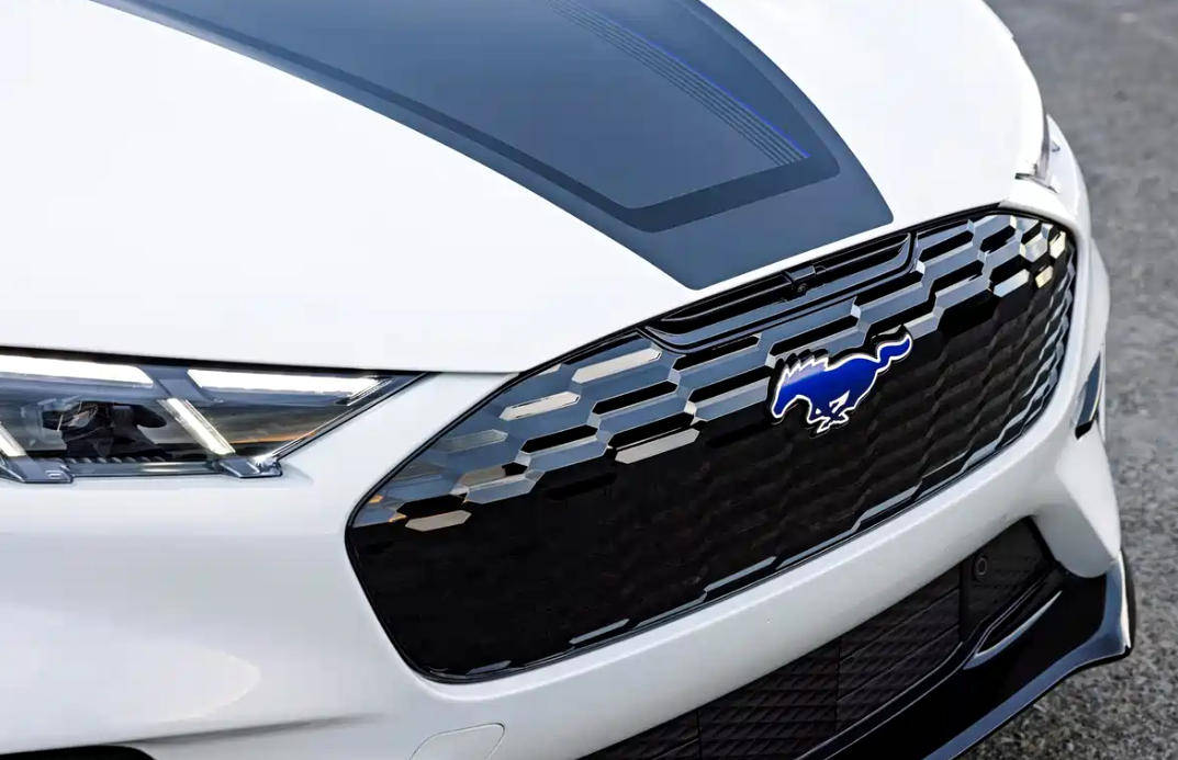外觀方面,特別版車型采用了全新的更具立體感的格柵,帶有藍色的野馬標識,前發動機蓋增加了專屬的拉花裝飾,描繪了落日余暉,并有California Special標識。輪圈也采用了全新的樣式,細節處展現GT/CS標識,是California Special的縮寫,并配備Brembo卡鉗。車門上還有Mach-E 4的藍色標識,尾標GT內部也有California Special標識。