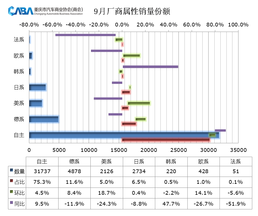 從廠商屬性來看,中國品牌9月份銷量超3.1萬輛,同比增長9.5%,市場占比達75.3%,繼續保持著較高的占比;德系品牌銷量超0.48萬輛,同比下滑11.9%,占比達11.6%。相較于8月份,環比增長8.4%;美系品牌銷量超0.21萬輛,同比下滑24.3%,環比增長18.7%,占比達5%;日系品牌銷量超0.27萬輛,同比下滑8.8%,占比達6.5%;韓系、歐系、法系銷量合計占比為1.6%。其中法系車銷量51輛,繼續保持低迷狀態,而韓系銷量220輛,同比增長47.7%。