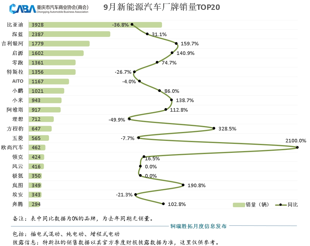 再看新能源汽車的表現:9月份,重慶新能源汽車廠牌銷量TOP20前三依然是比亞迪、深藍、吉利銀河,銷量分別為3928輛、2387輛、1779輛。