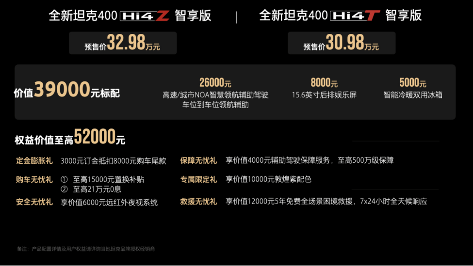 10月21日,全新坦克400以“潮酷越野新時代”為主題正式開啟預售,推出Hi4-T智享版和Hi4-Z智享版兩款配置,預售價分別為30.98萬元和32.98萬元。