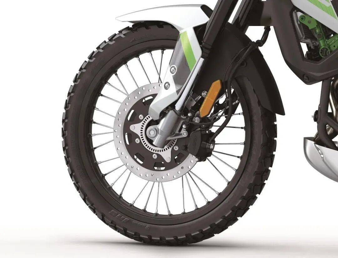 前制動為日清卡鉗搭配300mm單盤,后部為230mm盤,搭配了可關閉的ABS,非??上У牟]有配備TCS。輪組為前21后17輻條輪組,配備前90/90-21后140/70-17拉力胎。