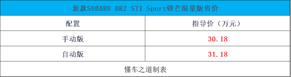 日前,新款SUBARU BRZ STI Sport鋒芒限量版上市,共推出2款配置,指導價區間為30.18萬和31.18萬元。作為限量版車型,新車配備帶有黃色縫線的制動手柄、座椅、方向盤、車門飾板、100臺限量銘牌及黑色BRZ車型徽章等專屬配置。此外,2025年10月15日-12月31日期間購買該車的用戶,可獲贈一套STI PLUS套件,包含STI自適應V形頂吧+STI自適應后阻尼桿+Plus套件標識。動力上,新車型依舊配備2.4升水平對置四缸發動機,最大功率234馬力,最大扭矩250牛·米,傳動系統匹配6速手動變速箱和6速手自一體變速箱可選。