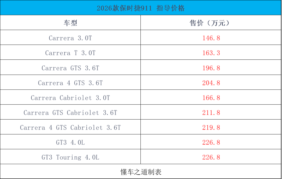 日前,我們從官方獲悉,2026款保時捷911正式迎來上市,共有10款車型,售價區間為146.8-226.8萬元。作為年代改款車型,新車主要針對配置進行調整,另外部分選裝配置價格進行了下調。