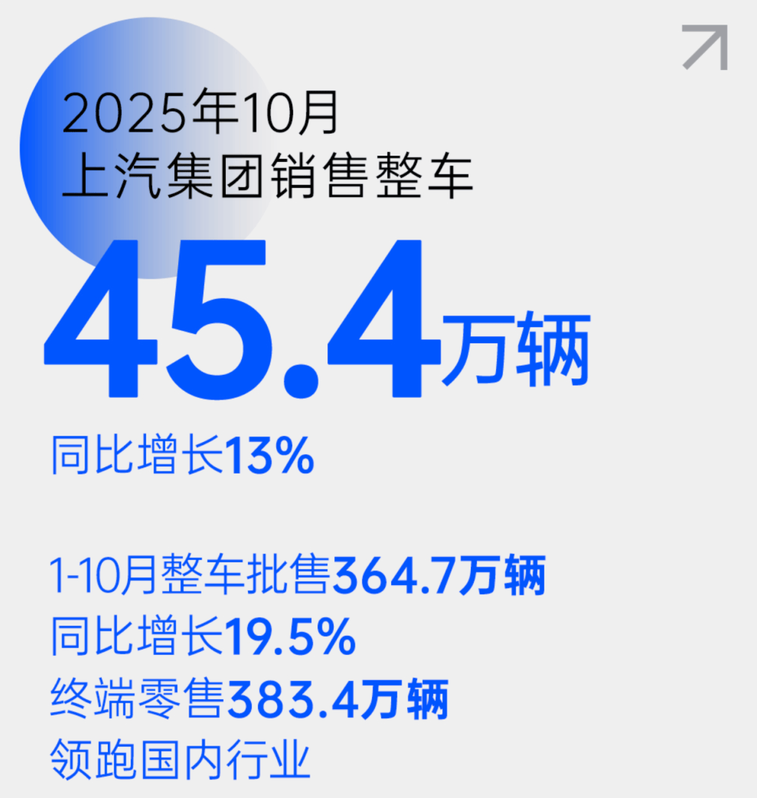 10月份銷量快報(bào)顯示,上汽集團(tuán)當(dāng)月銷售整車45.4萬(wàn)輛,位列行業(yè)第一。自主品牌、新能源車與海外市場(chǎng)這“三駕馬車”的合力推動(dòng),上汽實(shí)現(xiàn)了月度銷量同比“十連漲”,充分展現(xiàn)出作為頭部車企的韌性與活力。