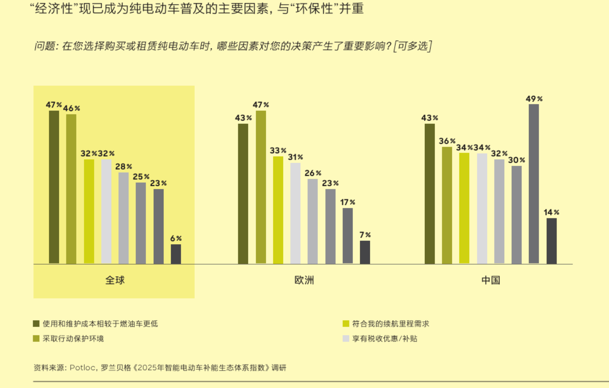 羅蘭貝格的調(diào)研數(shù)據(jù)顯示,盡管“環(huán)保性”仍是驅(qū)動(dòng)消費(fèi)者選擇電動(dòng)車的首要因素,但“經(jīng)濟(jì)性”正成為另一個(gè)關(guān)鍵考量因素。