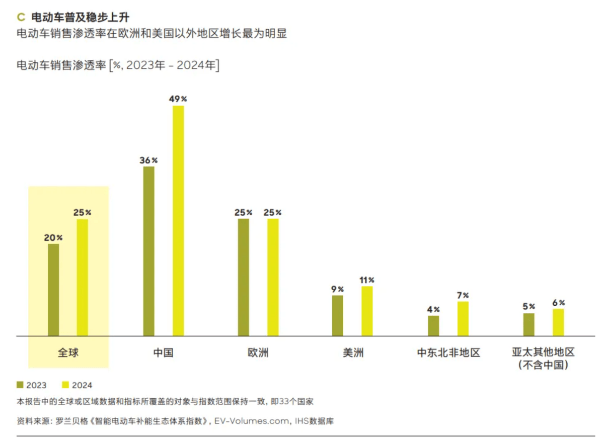 這項(xiàng)覆蓋全球33個(gè)市場(chǎng)、1.2萬(wàn)名受訪者的研究顯示,中國(guó)電動(dòng)車銷售滲透率從2023年的36%躍升至2024年的49%,遠(yuǎn)超全球25%的平均水平。這意味著在中國(guó),幾乎每賣出兩輛新車中就有一輛是電動(dòng)車。