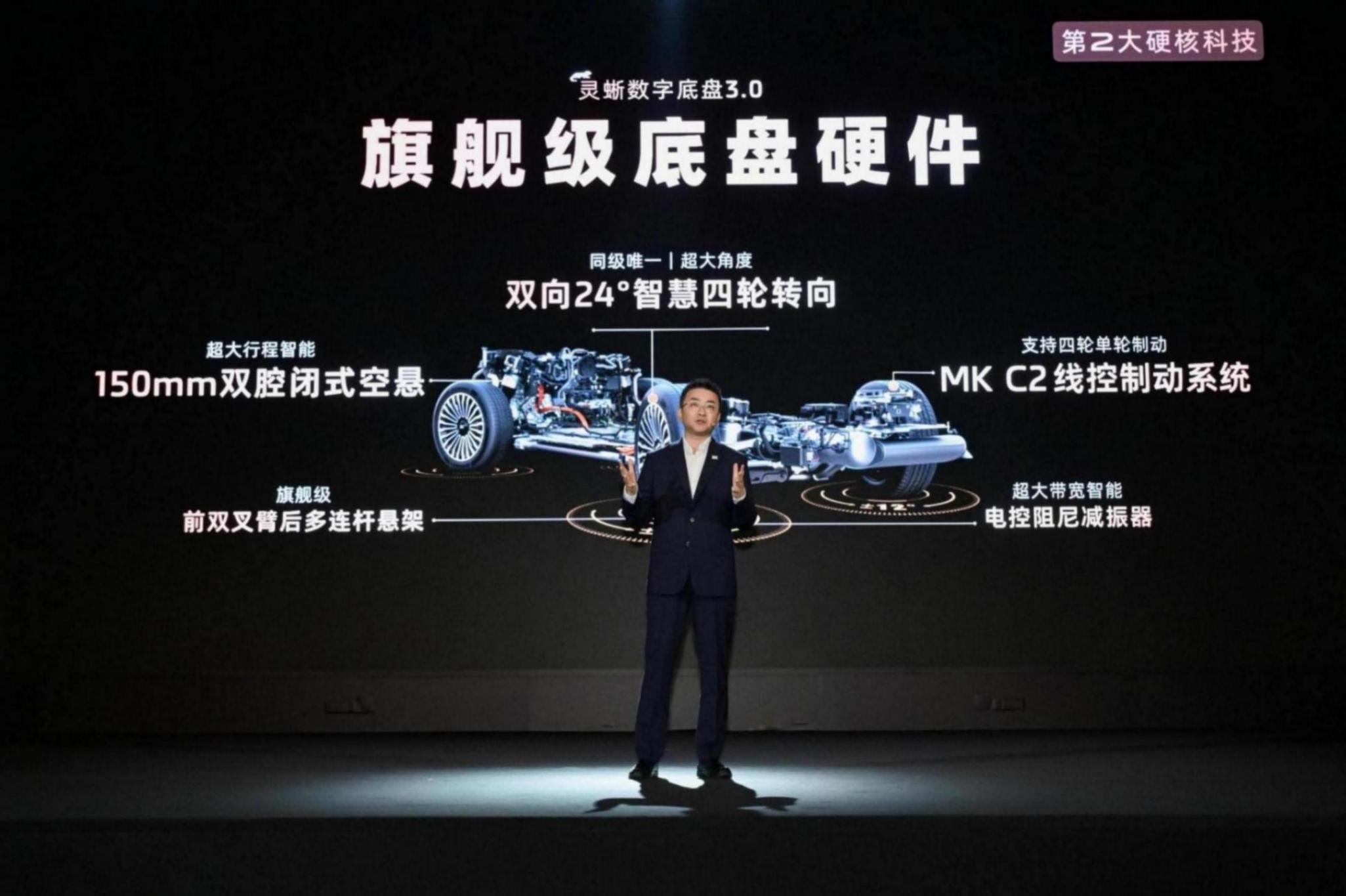 150mm超大行程封閉式雙腔空懸、雙向24度智慧四輪轉向系統、英偉達Thor芯片、520線超視域激光雷達、B&O音響系統、主駕以及二排右座4D機械按摩(四個獨立座椅均帶按摩)、全車三把零重力座椅、一體式超廣域智慧探射燈等等——相當于之前所宣傳的亮點配置,兩款車型均會搭載。