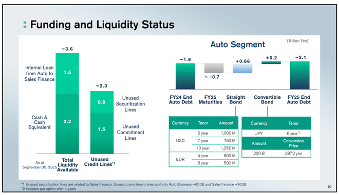 目前,日產汽車擁有3.6萬億日元的可流動性資金,其中包括近2.2萬億日元的現(xiàn)金及現(xiàn)金等價物儲備和近1.5萬億日元待償還的銷售金融公司貸,以及未使用的信貸額度為2.3萬億日元。