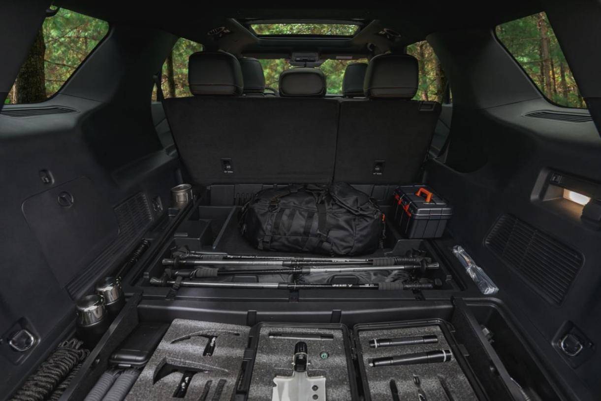 當然了,硬核實力是一方面,舒適體驗不可或缺。探險者昆侖穿越版配備的人體工學座椅配合精準調校的底盤系統,能夠有效過濾路面顛簸,再加上座椅按摩功能,大大提升了舒適性。還有在空間上面,是探險者昆侖穿越版的重頭戲,由于取消了第三排座椅,后備箱空間得到了釋放,它的后備箱常規狀態下容積達1505L,第二排放倒后更可擴展至2487L,能夠輕松容納雪板、自行車、露營裝備等大件物品,同時也能純平放到二排座椅,變成大床房。此外,后備箱儲物格多達15個,也算是進行了精細化設計。