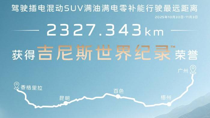 11月初,紅旗HS6 PHEV在吉尼斯見證下,從香格里拉出發,途經昆明、百色、梧州等城市,最終于11月3日的早10:15分抵達廣州,滿油滿電行駛2327.343公里,獲得“駕駛插電混動SUV滿油滿電零補能行駛最遠距離”吉尼斯世界紀錄™榮譽。