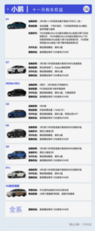 11月,小鵬對權益再次進行了加碼,為P7和G7推出了免息/低息貸或贈送積分等權益,并為復購老車主提供最長6年、每年1500度免費電卡的福利。