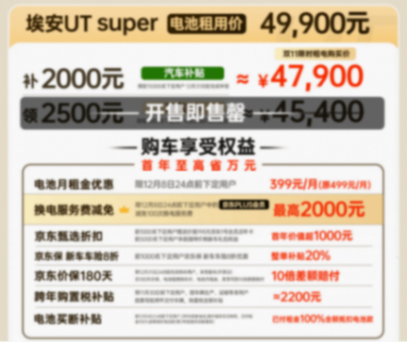 埃安與京東、寧德時代聯(lián)合打造的純電兩廂車埃安UT Super于2025年11月9日上市,它基于埃安UT打造,支持了寧德時代的巧克力換電網絡,并在京東商城上架銷售。