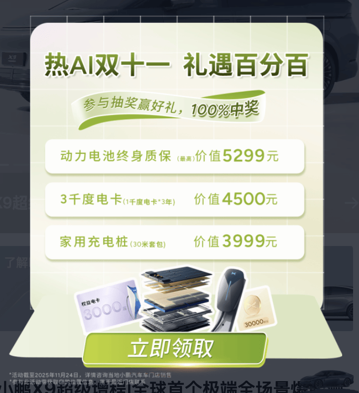 同時,小鵬也借著雙十一在商城開啟了抽獎活動,可抽取動力電池終身質保、3000度電卡、家充樁等權益,刺激潛在用戶下單。