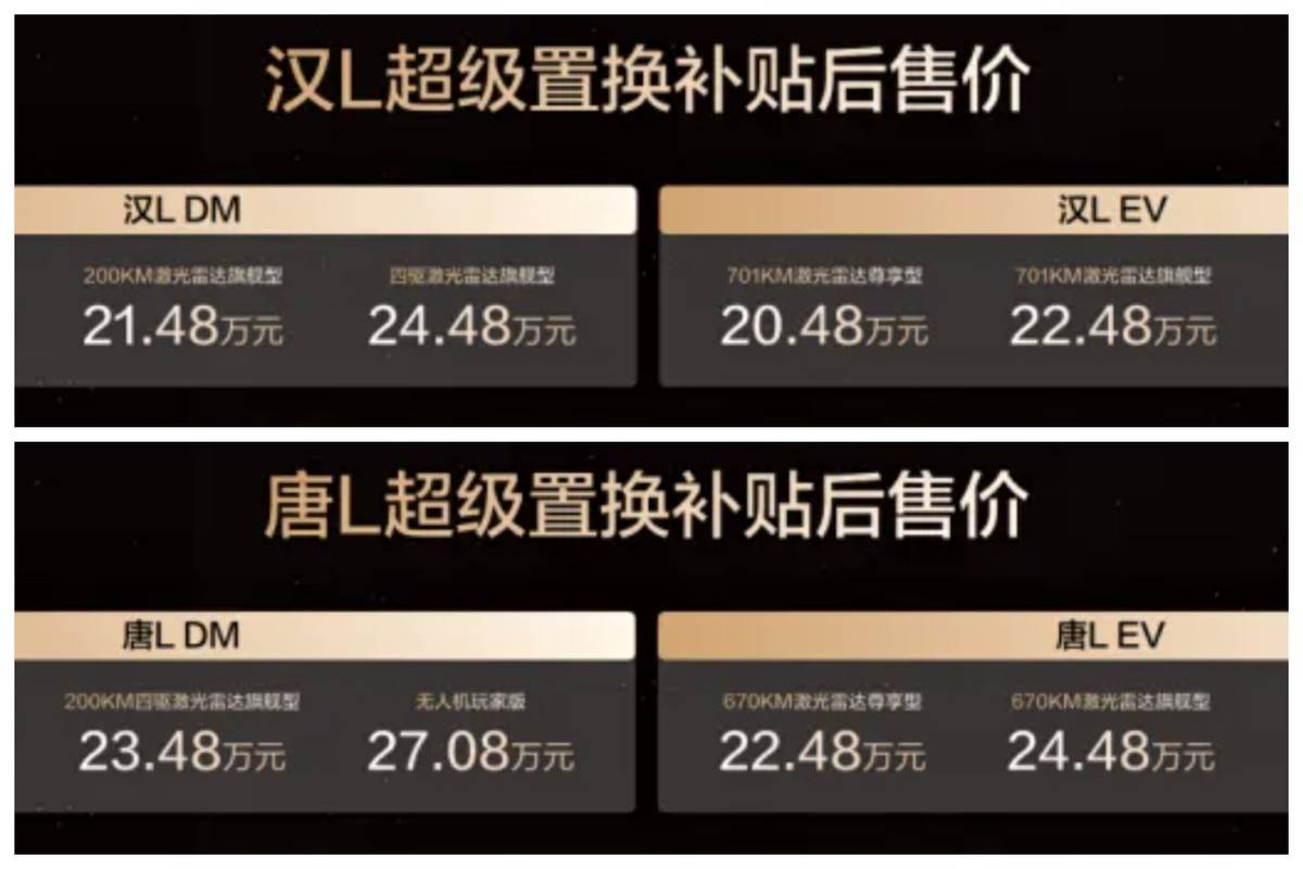 11月21日,2025廣州車展正式開幕,比亞迪正式發布漢L/唐L限時置換補貼價——漢L EV和DM分別推出3款車型,其中漢L EV超級置換補貼價區間為20.48-26.48萬元,漢L DM為19.48-24.48萬元;唐L EV和DM也分別推出3款車型,唐L EV超級置換補貼價的區間為22.48-27.48萬元,唐L DM 為21.48-27.08萬元。據悉,這一購車權益的截止日期為2025年12月31日。