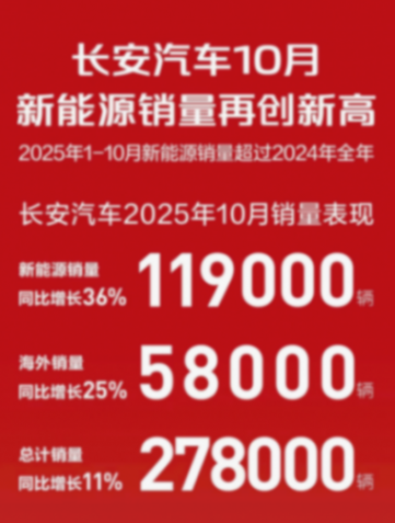 1-10月長(zhǎng)安新能源汽車?yán)塾?jì)銷量達(dá)86.9萬輛,同比增長(zhǎng)60.58%;2025年1-10月新能源銷量已超2024年全年新能源銷量。三大數(shù)智新能源品牌阿維塔、深藍(lán)汽車、均拿出了亮眼的成績(jī)單。