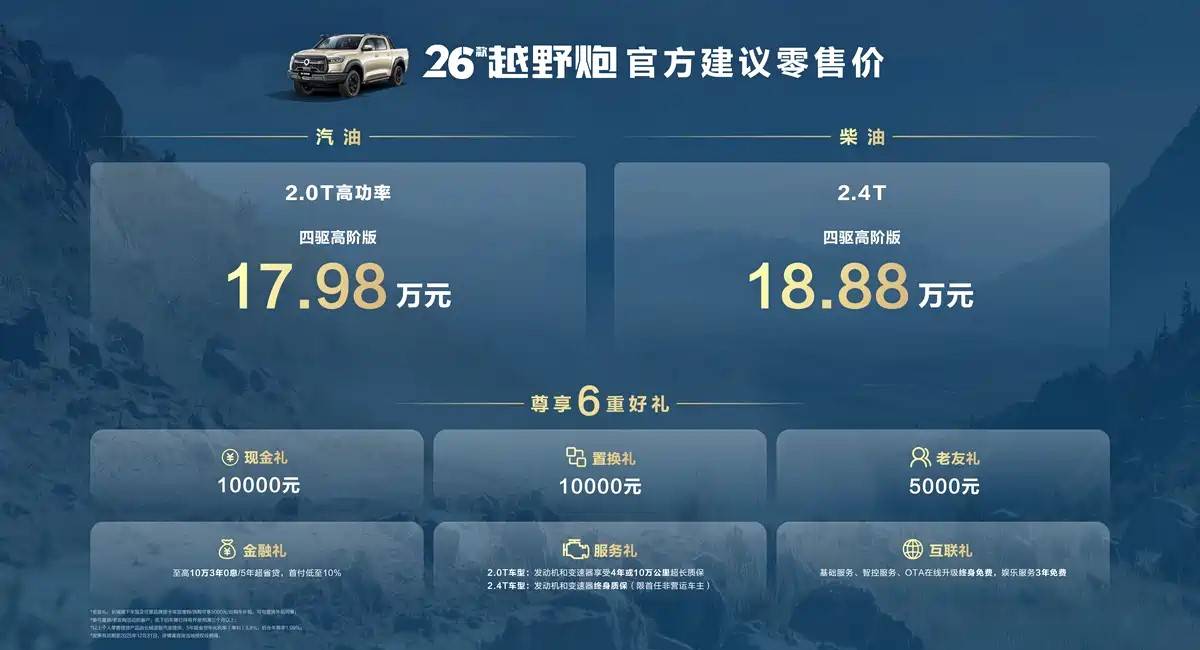 2025廣州車展于今日開幕,2026款長城越野炮正式上市,售價(jià)區(qū)間17.98-18.88萬元。新車針對(duì)外觀、座艙以及動(dòng)力系統(tǒng)進(jìn)行升級(jí)。2026款越野炮用戶可享10000元現(xiàn)金禮、10000元置換禮、5000元老友禮以及金融禮、服務(wù)禮、互聯(lián)禮六重大禮。