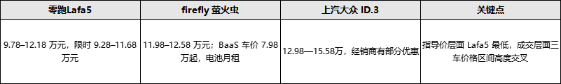 零跑Lafa5昨晚正式公布了上市價格,售價為9.78–12.18萬元,相比預售價的10.58-13.18萬元,著實足夠驚喜,但是它真的值這個價嗎?和競爭對手螢火蟲和大眾id3相比,誰才是真“值”,話不多說,咱們直接開始分析。