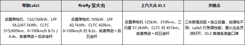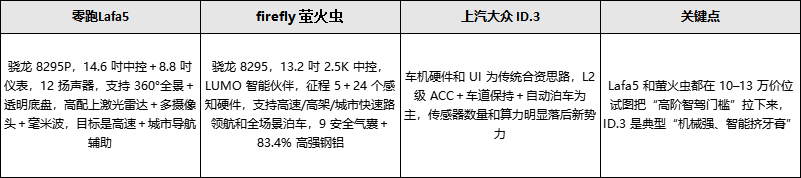 所以在智能化維度,Lafa5更像是把“高階智駕硬件下放”的那一位攪局者,螢火蟲則是“小車也要完整蔚來體驗”,ID.3選擇躺平。