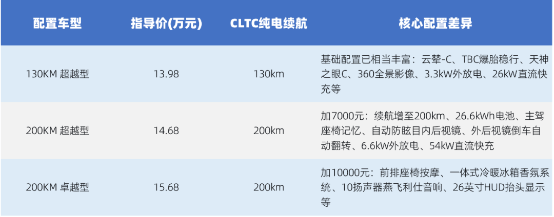 200KM 超越型在入門車型基礎(chǔ)上加7000元,差異點(diǎn)在于采用了26.6kWh電池,純電續(xù)航增至200km。這么看,7000元差價(jià)換來(lái)的是實(shí)實(shí)在在的續(xù)航提升,對(duì)充電方便的用戶來(lái)說(shuō),長(zhǎng)期下來(lái)會(huì)劃算。