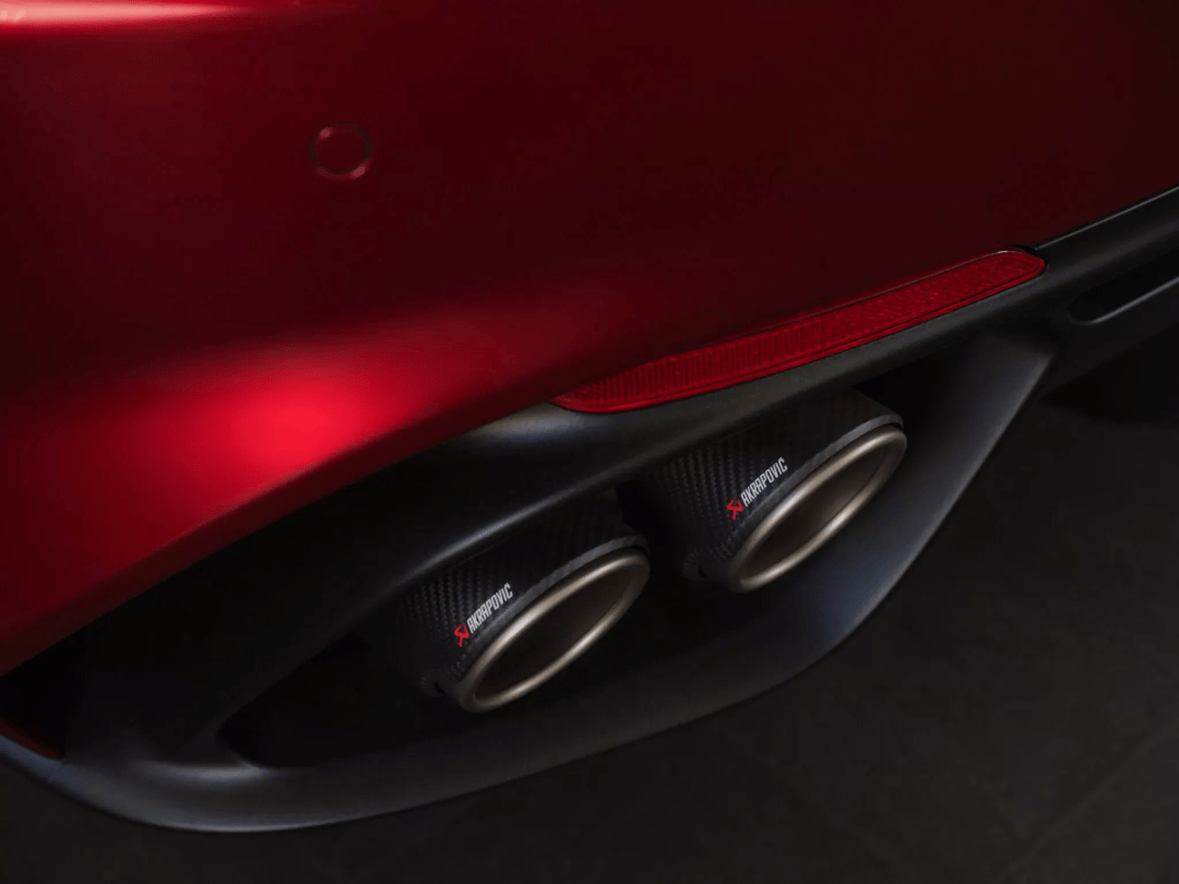 此外,Giulia還配備了碳纖維后視鏡外殼與碳纖維車頂,搭配深色輪轂和碳陶瓷制動系統,卡鉗采用拉絲陽極氧化工藝處理,點綴紅色阿爾法·羅密歐標識,同時搭載帶有碳纖維裝飾的Ak排氣系統。