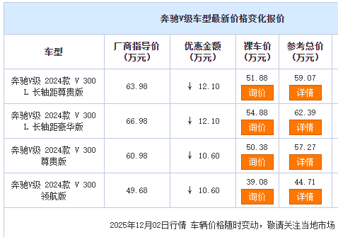 近期豪華MPV市場掀起降價風(fēng)暴,奔馳V級以最高12.10萬的降幅震撼全場,讓這款德系商務(wù)標桿的準入門檻大幅降低。據(jù)多地經(jīng)銷商信息,2024款主力車型V300領(lǐng)航版指導(dǎo)價49.68萬,優(yōu)惠后僅需37.58萬起,部分地區(qū)疊加置換補貼后,入門價更是下探至35萬區(qū)間,性價比優(yōu)勢凸顯。