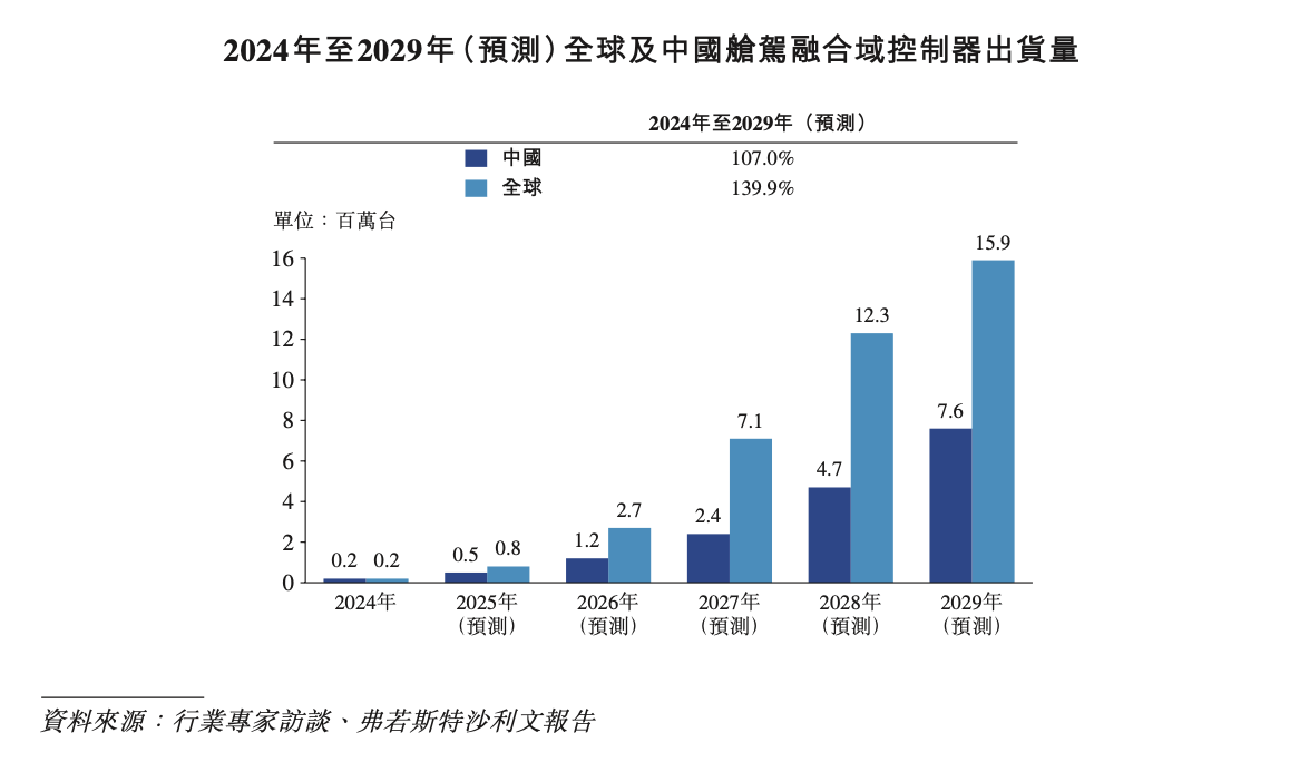 招股書顯示,車聯天下已獲得九個艙駕融合域控制器的定點項目,另有三個納入項目正在推進中。弗若斯特沙利文的資料顯示,中國艙駕融合域控制器行業的乘用車裝機量將由2024年的20萬臺增長至2029年的7.6百萬臺,復合年增長率高達107.0%。