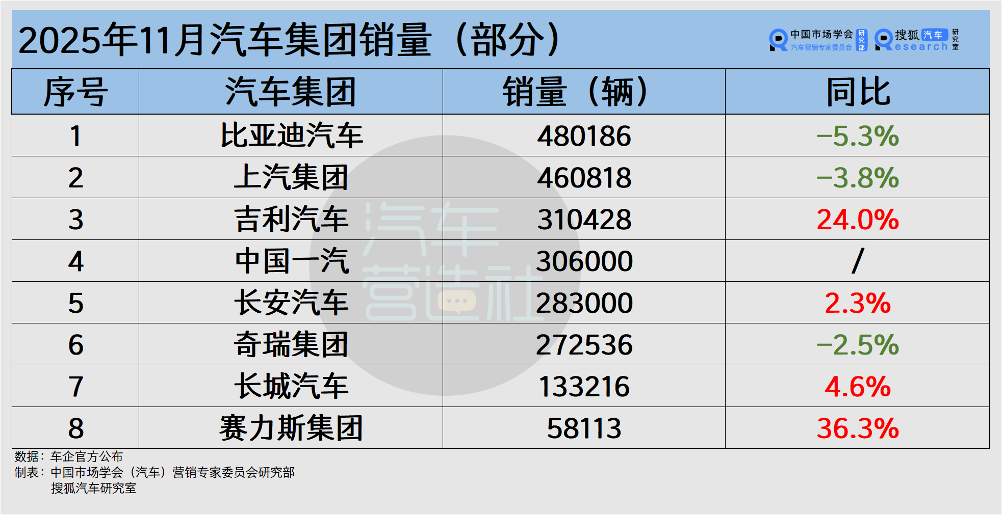 已公布的8家汽車集團中,比亞迪汽車、上汽集團和吉利汽車拿下前三,其中比亞迪汽車超越上汽集團重回月度銷冠,11月銷48萬輛,創年內單月銷量新高。