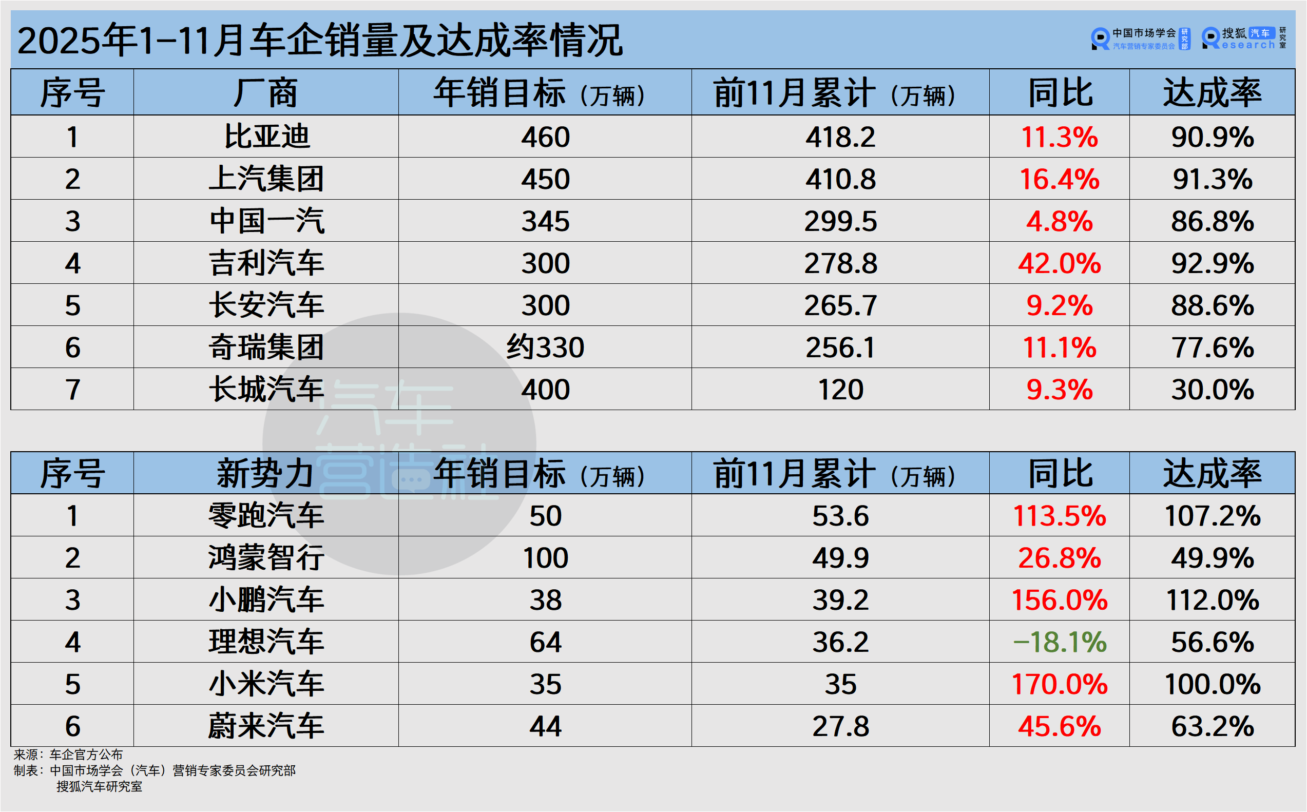 距離2025年“交卷”還剩1個月,又到了車企們匯報年銷目標達成率的關鍵節點:截止2025年11月,新勢力中零跑、小鵬、小米都已提前鎖定年度銷量目標;比亞迪、上汽以及吉利的年銷目標達成率也來到90%以上。