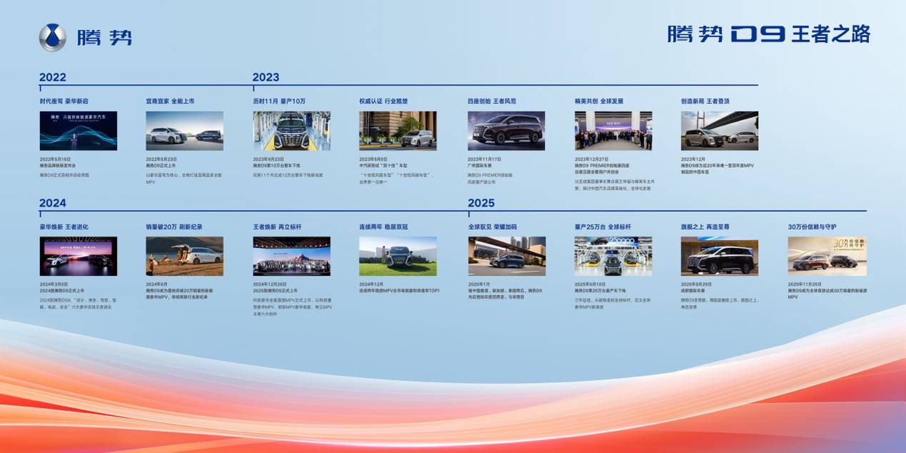 騰勢(shì)D9的成功,是中國品牌創(chuàng)新發(fā)展之路的一個(gè)縮影。作為全球首款達(dá)成第30萬輛交付的新能源MPV,騰勢(shì)D9如今在更高的起點(diǎn)上持續(xù)突破。在不遠(yuǎn)的將來,MPV冠軍騰勢(shì)D9將持續(xù)獲得精英圈層的認(rèn)同,與每一位用戶一起向著美好生活,騰勢(shì)而上!