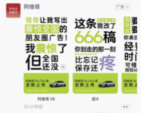 “這條朋友圈文案我改了666稿”“領導讓我寫出震驚全國的朋友圈廣告”“領導說要錢給錢要人給人”等小編心態“大字突出”,阿維塔06 Elite全新上市則在“小字角落”。
