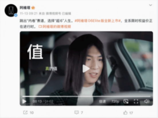 同樣模式也出現在該款車型的其它營銷之中。比如11月阿維塔06Elite版的系列廣告片,用頭發拉直、健身姿勢直,粗暴地喊出“不卷,很直(值)”的廣告語,沒有細述產品細節,可能讓人摸不到頭腦,但真要買車的用戶可能還是會去網上查一下、到線下比一下。
