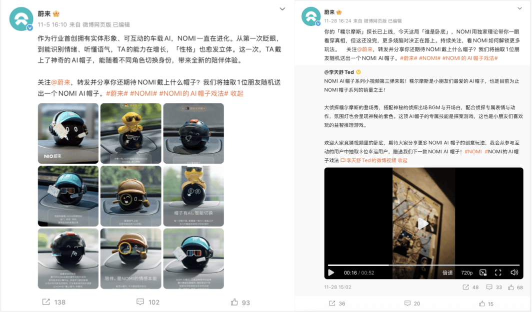 這一讓蔚來服務更加形象化的小人兒,在蔚來的經營下已經有了“養成系機器人”的感覺,配上不同的AI帽子,就能擁有不同的屬性,或化身rapper、或化身劇本殺主持人、或化身領航員……一時間竟然有了與labubu一決雌雄的能力。